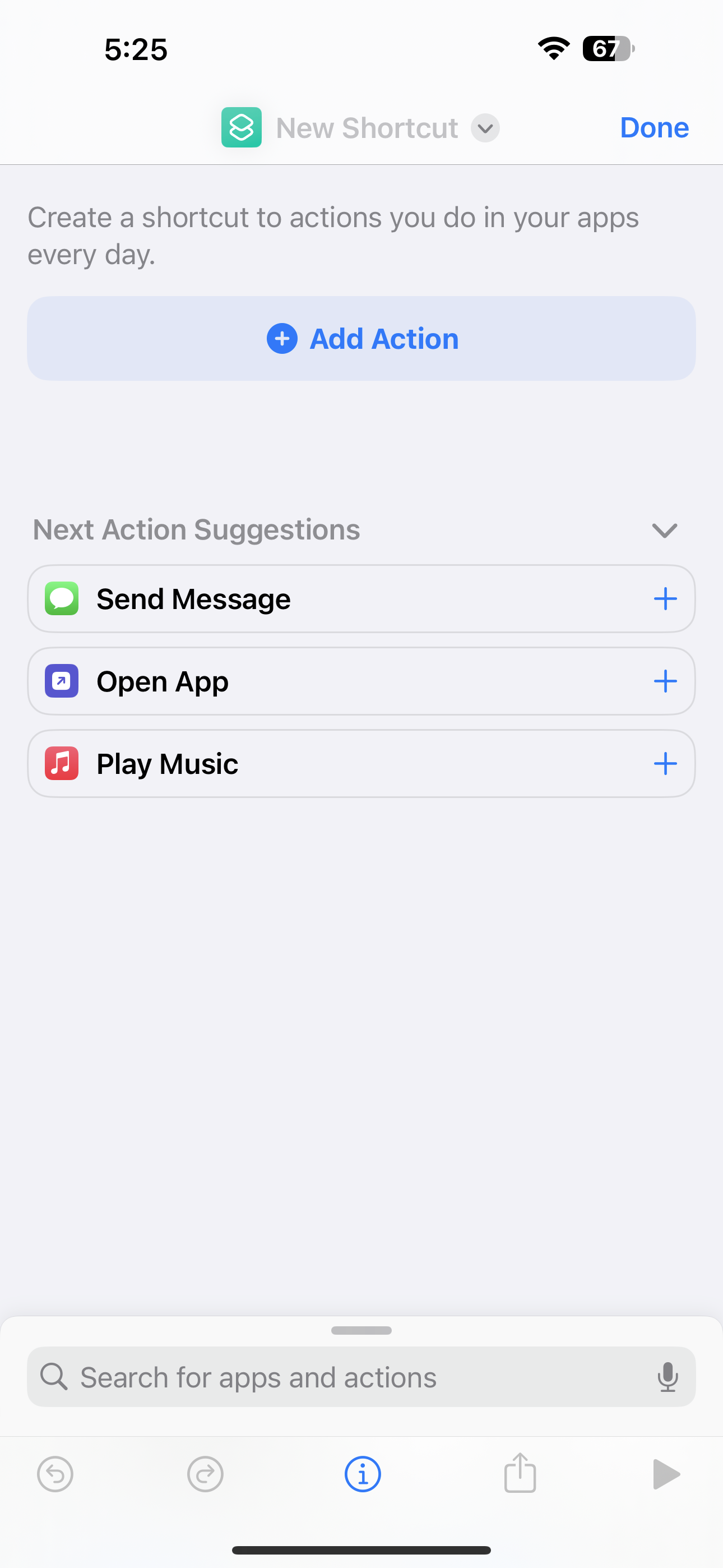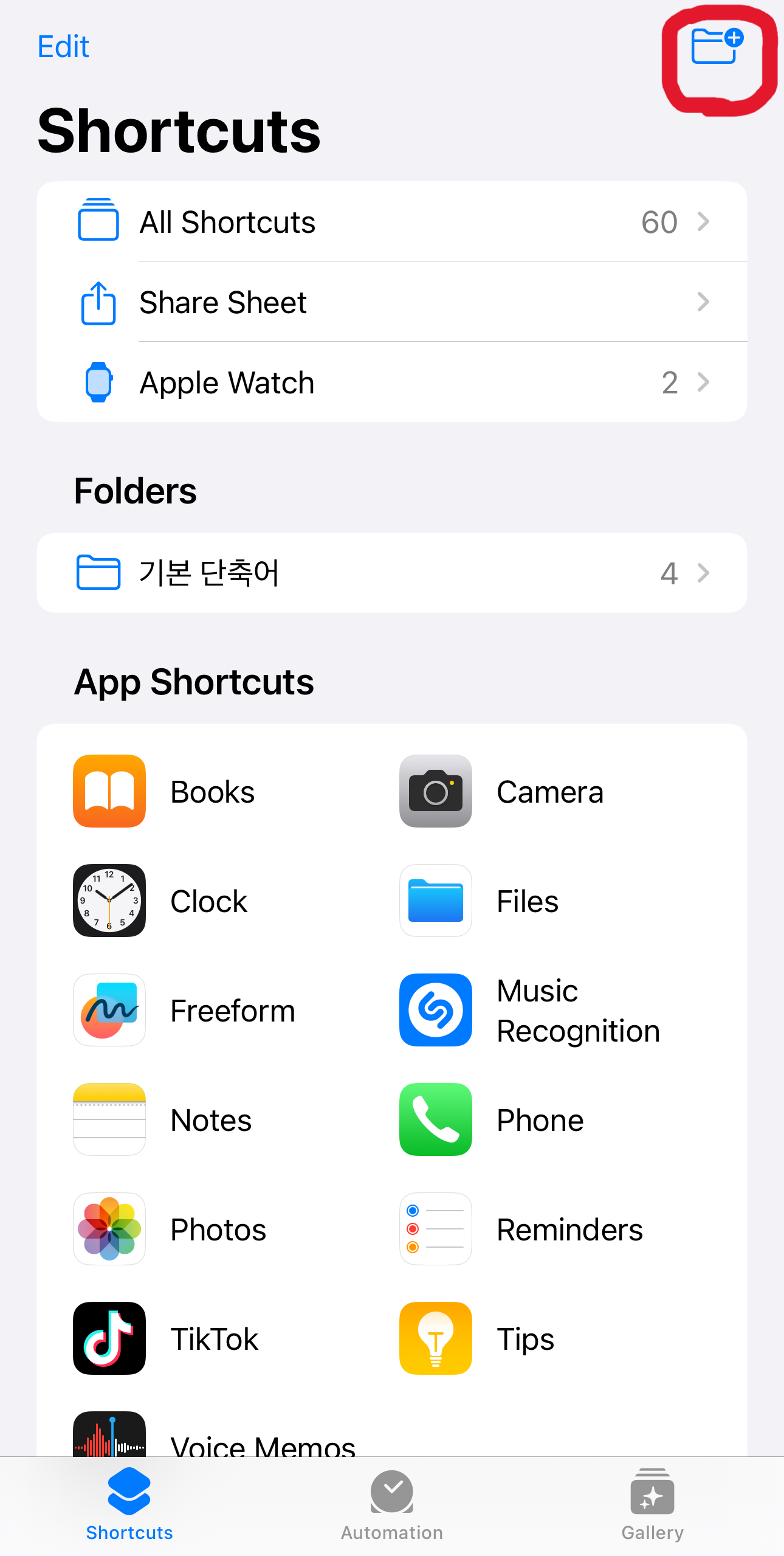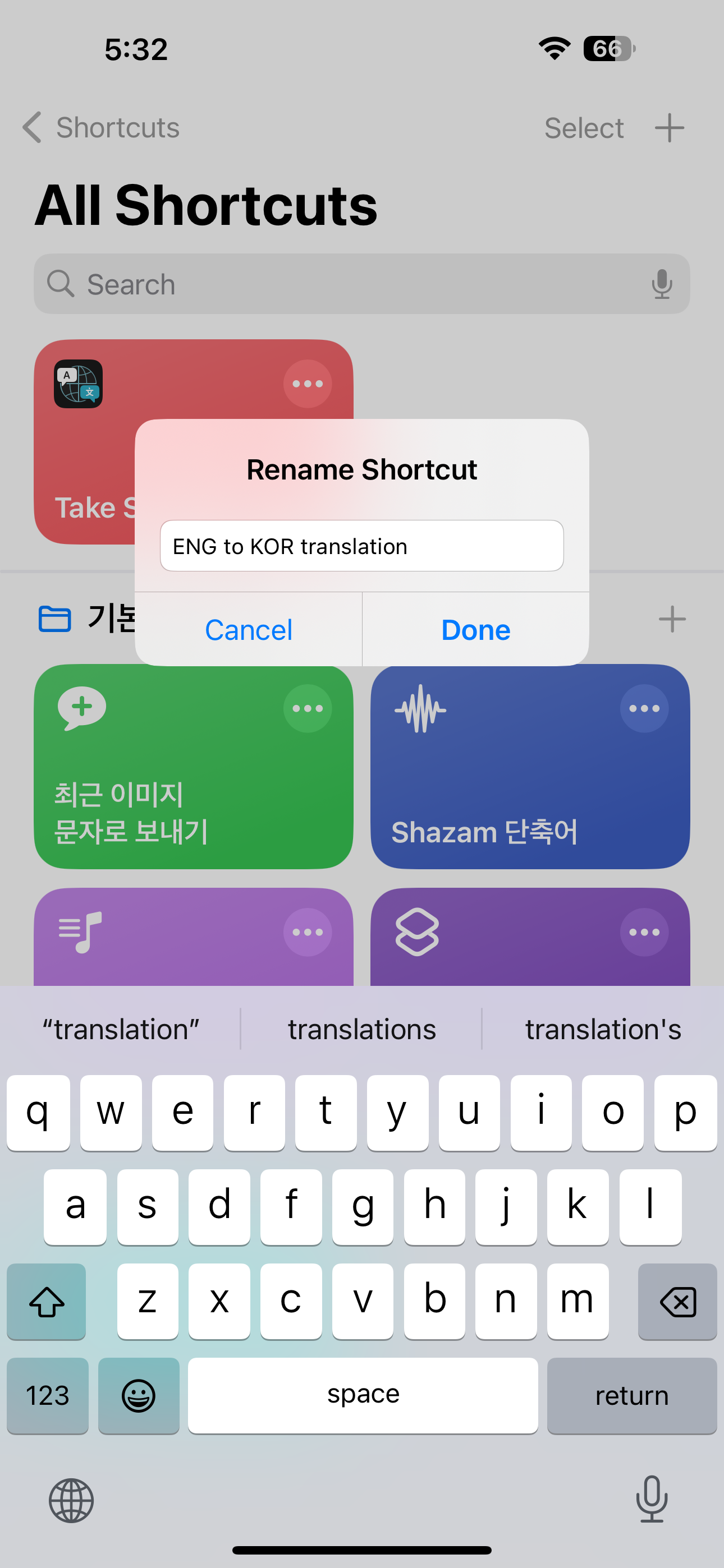 1. First, find the “Shortcuts" app and make a new shortcut like this. You may name it however you want. I named it “ENG to KOR translation.”