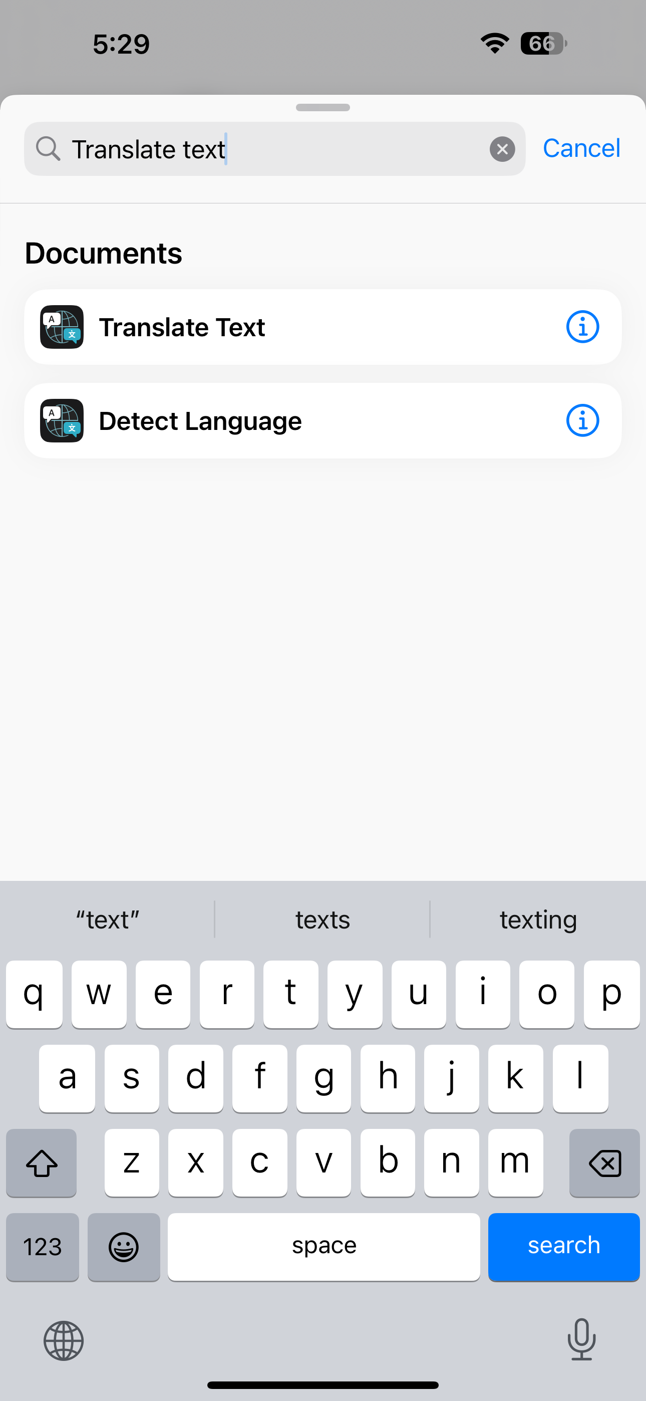 4. Again, pull up the search bar from the bottom of the screen. Now search for “Translate text.”
